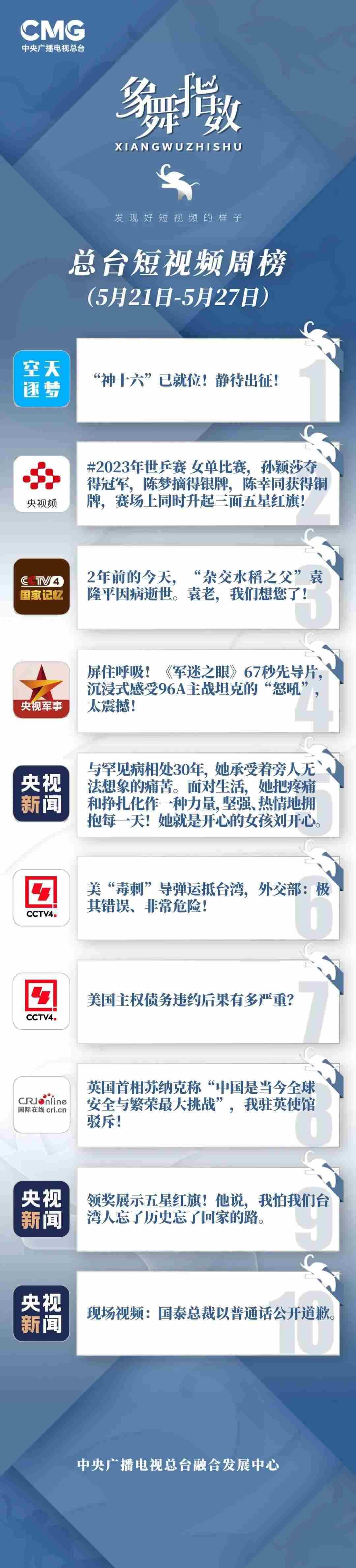 中央廣播電視總臺(tái)“象舞指數(shù)”評(píng)議品牌,推出主流媒體短視頻周榜、總臺(tái)短視頻周榜。在2023年5月21日—5月27日,這些內(nèi)容引發(fā)大眾關(guān)注: