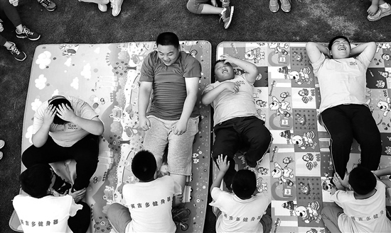 在一個中小學超重學生健康夏令營里,孩子們在做仰臥起坐。何海兒 攝/視覺中國