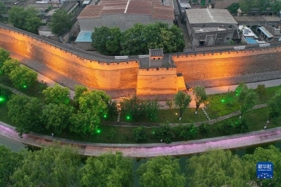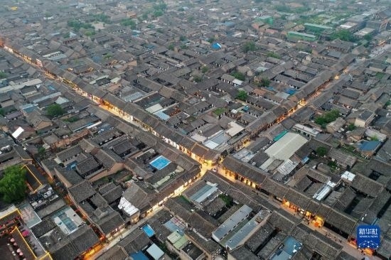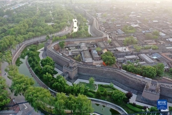 游客在平遙古城城墻上游覽(5月30日攝,無人機照片)。