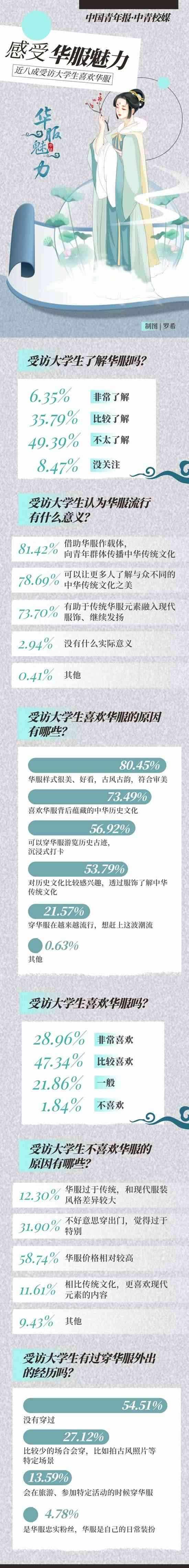 穿華服正在成為一些年輕人旅游或日常出行的選擇?!叭A服”,是指具有中華民族歷史文化基因、精神風(fēng)貌,且融合當(dāng)代審美的禮儀性服裝,其服裝風(fēng)格根植于中華傳統(tǒng)文化,傳承中華民族特質(zhì),體現(xiàn)當(dāng)代社會(huì)積極向上的時(shí)代精神,具有鮮明的辨識(shí)度,適用于國(guó)際交往、文化交流、商貿(mào)往來(lái)以及日常節(jié)慶、典祭等禮儀場(chǎng)合。自2018年起,每年的農(nóng)歷三月初三被選定為“中國(guó)華服日”,在前不久結(jié)束的第五屆“中國(guó)華服日”活動(dòng)中,上萬(wàn)名青年華服愛(ài)好者匯聚活動(dòng)現(xiàn)場(chǎng)參與體驗(yàn)。近日,中國(guó)青年報(bào)社·中青校媒面向全國(guó)高校大學(xué)生發(fā)起問(wèn)卷調(diào)查,共回收117所高校學(xué)生填寫的有效問(wèn)卷1464份。調(diào)查結(jié)果顯示,76.30%受訪者表示喜歡華服,42.14%受訪者表示對(duì)華服有一定的了解。