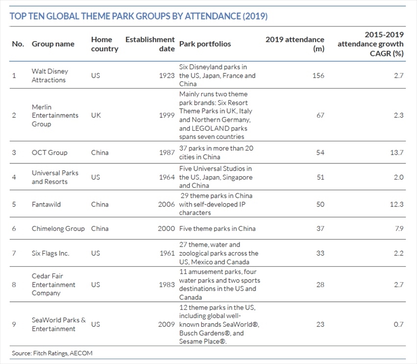 惠譽(yù)評(píng)級(jí)今年4月發(fā)布的主題公園藍(lán)皮書(Fitch China Theme Park Industry Blue Book)則顯示,從2019年全球各大主題公園集團(tuán)旗下樂園的游客量來看,迪士尼公司以2019年全年15.6億人次的游客量穩(wěn)居第一。排名第二的為英國(guó)默林集團(tuán)旗下度假區(qū)及樂高樂園的游客量,約6700萬(wàn)人次,不及迪士尼公司游客量的一半。