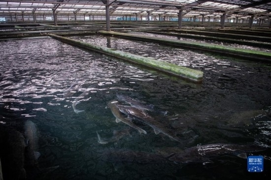 6月7日在中國(guó)清江(宜都)鱘魚(yú)谷養(yǎng)殖車(chē)間拍攝的鱘魚(yú)。