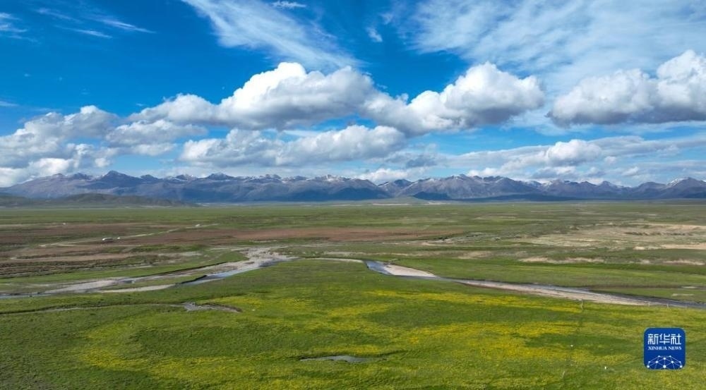 夏日,青海省南部的高原草原一碧千里,與雪山、白云相映成趣,景色宜人。
