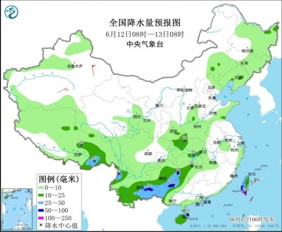 圖2 全國(guó)降水量預(yù)報(bào)圖(6月12日08時(shí)-13日08時(shí)) 圖片來源:中央氣象臺(tái)網(wǎng)站