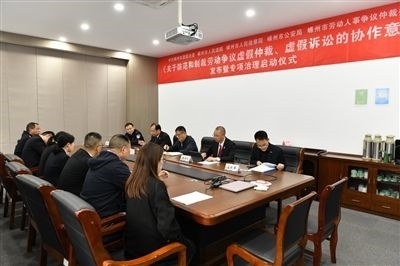 嵊州市委政法委、市法院、市檢察院、市公安局、市勞動仲裁委聯(lián)合舉行《關(guān)于防范和制裁勞動爭議虛假仲裁、虛假訴訟的協(xié)作意見》發(fā)布暨專項治理啟動儀式。