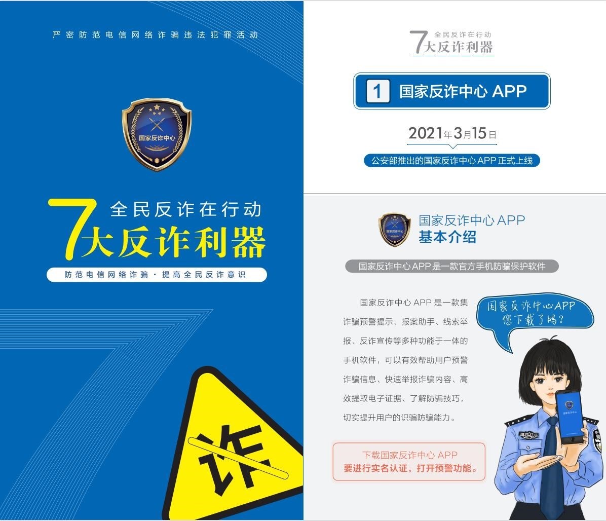 聚焦“關口前移、預防為先”,《手冊》詳細介紹了過去兩年里,公安部會同工信部、中國人民銀行聯(lián)合推出的七大反詐利器——國家反詐中心APP、96110預警勸阻專線、12381涉詐預警勸阻短信系統(tǒng)、全國移動電話卡“一證通查”、云閃付APP“一鍵查卡”、反詐名片、全國互聯(lián)網(wǎng)賬號“一證通查2.0”的主要功能和下載查詢方法,鼓勵廣大群眾多下載多使用,共同構筑攔截電信網(wǎng)絡詐騙的“防火墻”。