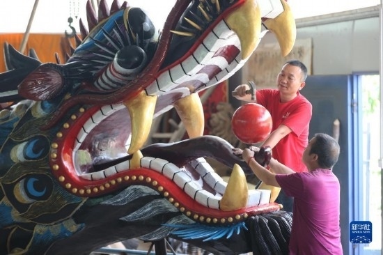 6月17日,藝人在鎮(zhèn)遠(yuǎn)古城龍舟文化傳承基地制作龍頭。