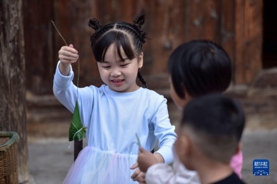 6月16日,小朋友在鎮(zhèn)遠(yuǎn)古城 陽河畔體驗(yàn)包粽子。