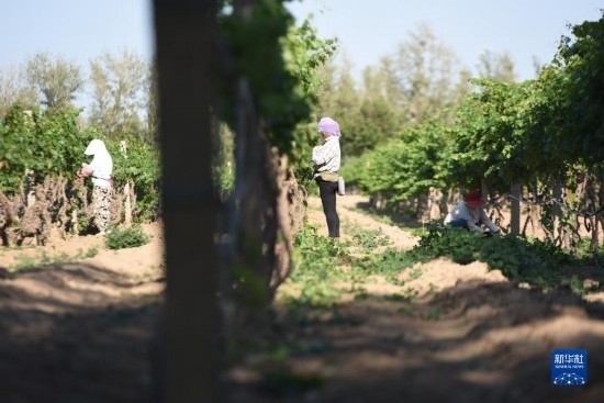 6月21日,在河北省懷來縣長城桑干酒莊葡萄種植基地,當?shù)剞r(nóng)民在田間勞作。