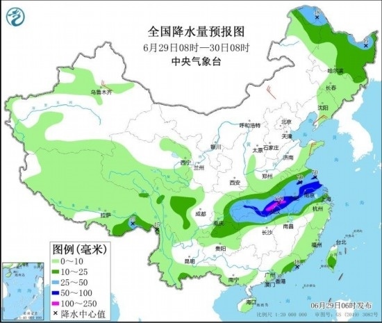 中央氣象臺6月29日06時繼續(xù)發(fā)布暴雨藍色預警和強對流天氣黃色預警:預計,6月29日08時至30日08時,黃淮南部、江淮、江漢中南部、江南北部、重慶東部以及黑龍江北部、內蒙古東北部等地部分地區(qū)有大到暴雨,其中,湖北東部等地局地有大暴雨(100~150毫米)。上述部分地區(qū)伴有短時強降水(最大小時降雨量30~50毫米,局地可超過70毫米),黑龍江中部、安徽中南部、江蘇中南部、上海西北部、湖北東部等地的部分地區(qū)將有8~10級雷暴大風或冰雹天氣,局地風力11級,江蘇中南部局地可能伴有龍卷(見圖1和圖2)。強對流的主要影響時段為今天午后至夜間。