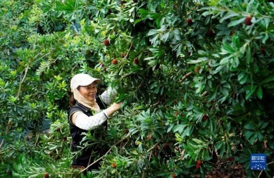 湖南省靖州苗族侗族自治縣渠陽(yáng)鎮(zhèn)官團(tuán)村的果農(nóng)采摘楊梅(6月18日攝)。