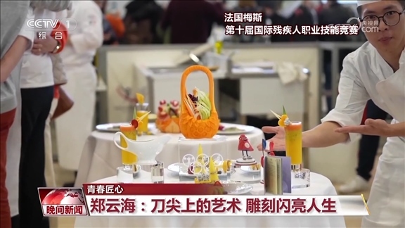 功夫不負有心人,鄭云海的雕刻技藝不斷精進,他也開始自主設計創(chuàng)作作品,并斬獲了多項國內比賽冠軍。今年3月,在法國梅斯舉辦的第十屆國際殘疾人職業(yè)技能競賽食品雕刻項目比賽中,他奪得金牌,成為食品雕刻屆的世界冠軍。