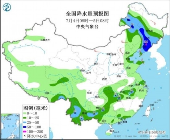 7月4日08時至5日08時,7月4日08時至5日08時,內(nèi)蒙古東北部、黑龍江西南部、吉林、遼寧中東部、云南西部和南部等地部分地區(qū)有大到暴雨,其中,遼寧東北部等地局地有大暴雨(100~120毫米)。內(nèi)蒙古、黑龍江、遼寧、河北北部、山東半島等地部分地區(qū)有4~6級風(fēng)。
