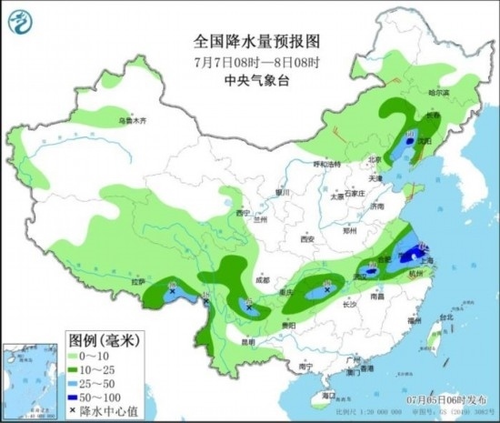 全國降水量預報圖(7月5日08時-6日08時)。圖片來源:中央氣象臺網(wǎng)站