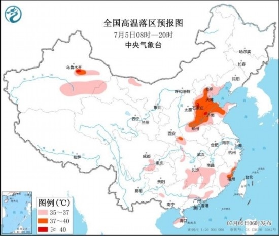 預計7月5日白天,河北中南部和東北部、北京大部、天津、山東大部、河南中北部及湖南中南部、江西中南部、福建中東部、廣東中部、新疆南疆盆地東部等地有35℃以上高溫天氣,其中,河北中南部、北京東部、天津南部、山東中北部、河南北部等地部分地區(qū)最高氣溫37~39℃,局地可達40℃以上。中央氣象臺7月5日06時繼續(xù)發(fā)布高溫黃色預警。