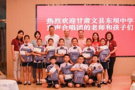 7月4日中午,在中國記協(xié)會客廳,文縣東壩童聲合唱團的孩子們見到了他們熟悉的中國記協(xié)黨組書記、副主席劉思揚爺爺。今年2月,劉思揚爺爺專門來到文縣,走進他們的排練廳,聆聽了他們即將在甘肅廣播電視總臺演出的曲目。他當(dāng)場說:“我被孩子們眼中的光深深地觸動了。這是一種自信的、堅毅的光。帶著這種光,無論你們將來走出大山,還是學(xué)成后回到山里建設(shè)家鄉(xiāng),這種自信和堅毅的情愫都將伴隨你們終生?!苯裉旌⒆觽兌汲闪藙⑺紦P爺爺?shù)男】腿?。劉爺爺給孩子們講述了什么是記者、什么是記協(xié),鼓勵孩子們好好學(xué)習(xí),將來報效祖國。劉爺爺還為每個孩子準(zhǔn)備了滿滿一個大書包的各種禮物。孩子們排著演出隊形,為中國記協(xié)的老師們唱出了《大山里的孩子》,還有那首剛剛學(xué)會的、走進央視錄音棚的《童心里的中國》: