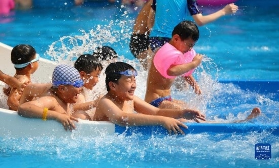 7月9日,孩子們在山東省滕州市一處水上公園戲水消暑。