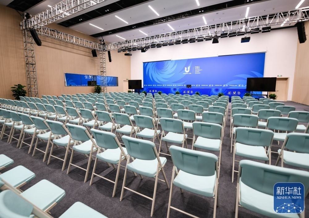 ↑這是7月13日拍攝的成都大運(yùn)會(huì)主媒體中心新聞發(fā)布廳。新華社記者 王曦 攝