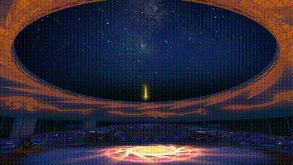特效數(shù)字焰火與太陽神鳥金芒旋轉(zhuǎn)倒計(jì)時(shí)融合,依次出現(xiàn)“12、11……1”的倒計(jì)時(shí)數(shù)字,隨后一朵金色芙蓉花綻放。