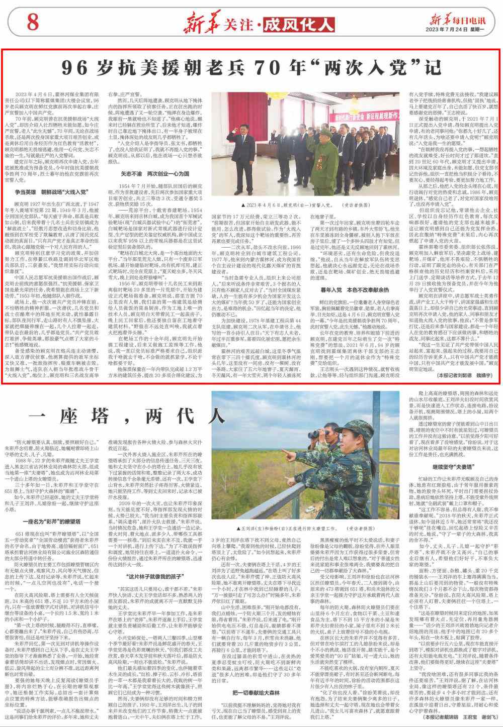 70年前,顧克明曾在抗美援朝戰(zhàn)場(chǎng)“火線入黨”,卻因介紹人壯烈犧牲未能如愿,如今莊嚴(yán)宣誓,老人“此生無(wú)憾”。70年間,無(wú)論在戰(zhàn)場(chǎng)殺敵,還是兩次投身國(guó)家重大項(xiàng)目艱苦創(chuàng)業(yè),或是離休后用自身經(jīng)歷作為紅色教育“活教材”,顧克明都絕無(wú)畏縮逃避,他用一心向黨、矢志不渝的一生,寫就最莊嚴(yán)的入黨誓詞。