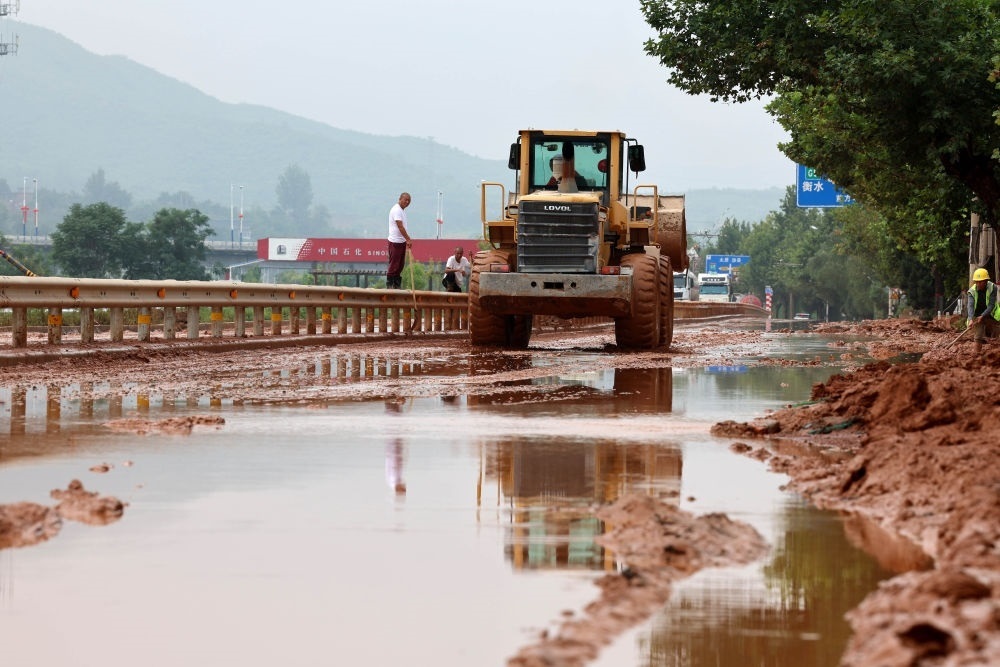7月31日,在河北省石家莊市井陘縣307國(guó)道長(zhǎng)崗村段,防汛工作人員駕駛機(jī)械清理淤泥。新華社發(fā)(梁子棟攝)