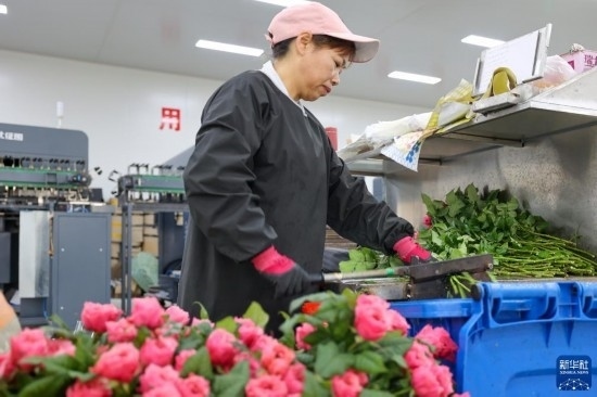 在云天化晉寧花卉產(chǎn)業(yè)現(xiàn)代化示范園內(nèi),花農(nóng)們將預(yù)冷處理后的鮮花放入自動分揀流水線(7月12日攝)。新華社記者 崔文 攝