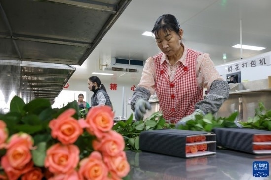在云天化晉寧花卉產(chǎn)業(yè)現(xiàn)代化示范園內(nèi),一名花農(nóng)在對包裝流水線上的鮮花進(jìn)行包裝(7月12日攝)。新華社記者 崔文 攝