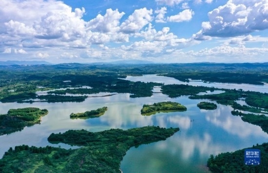 8月6日,湖南桂陽(yáng)舂陵國(guó)家濕地公園,綠水、濕地、藍(lán)天相映成趣,構(gòu)成一幅秀美的夏日生態(tài)畫卷(無(wú)人機(jī)照片)。