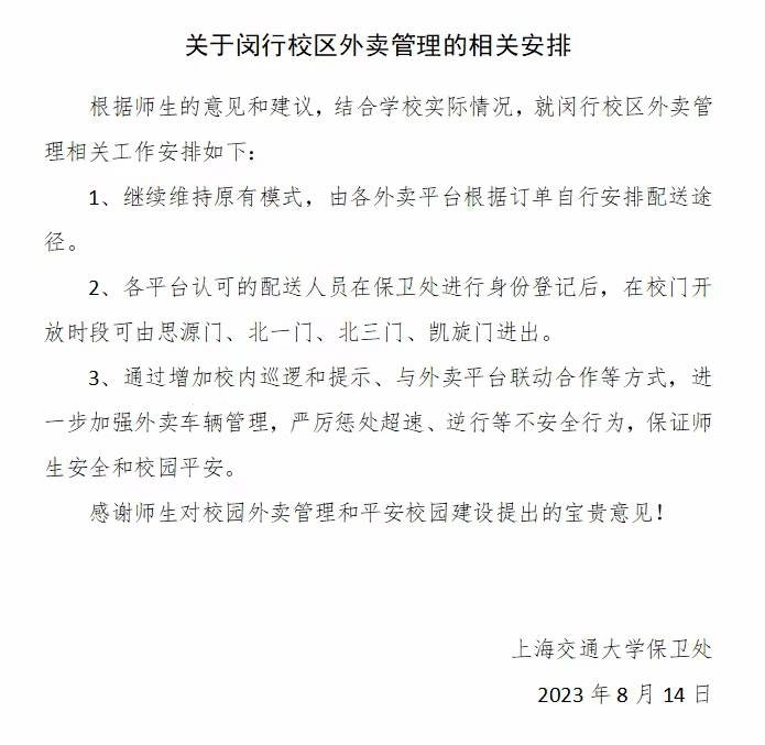 通知顯示,即日(8月3日)起,原外賣平臺向保衛(wèi)處備案過的外賣配送員,可從東川路600號(“凱旋門”)入校完成配送,未經(jīng)平臺報備的外賣配送員禁止進校配送,只需將交大外賣訂單送至就近中轉(zhuǎn)站即可。9月1日起,所有外賣配送員禁止入校,校園外賣專送團隊承接所有校園外賣訂單。