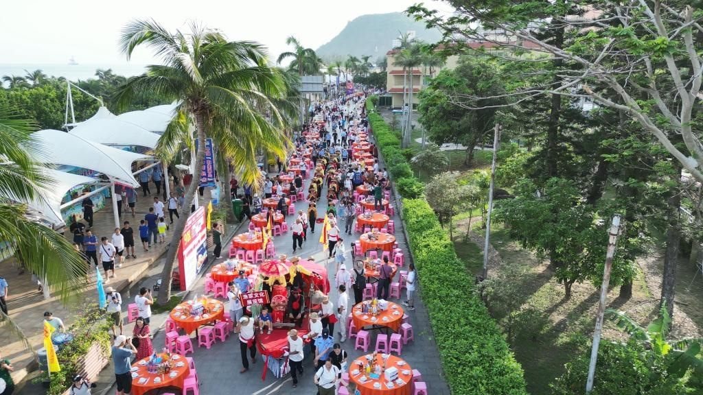 上千桌宴席沿街?jǐn)[開(kāi),來(lái)自五湖四海的游客和當(dāng)?shù)貪O民們歡聚一堂,沐浴著星光與海風(fēng),從五柳紅古魚(yú),到海膽海鮮飯,一道道漁家美食端上餐桌,讓食客品嘗舌尖美味,感受來(lái)自海陵島的獨(dú)特風(fēng)味。