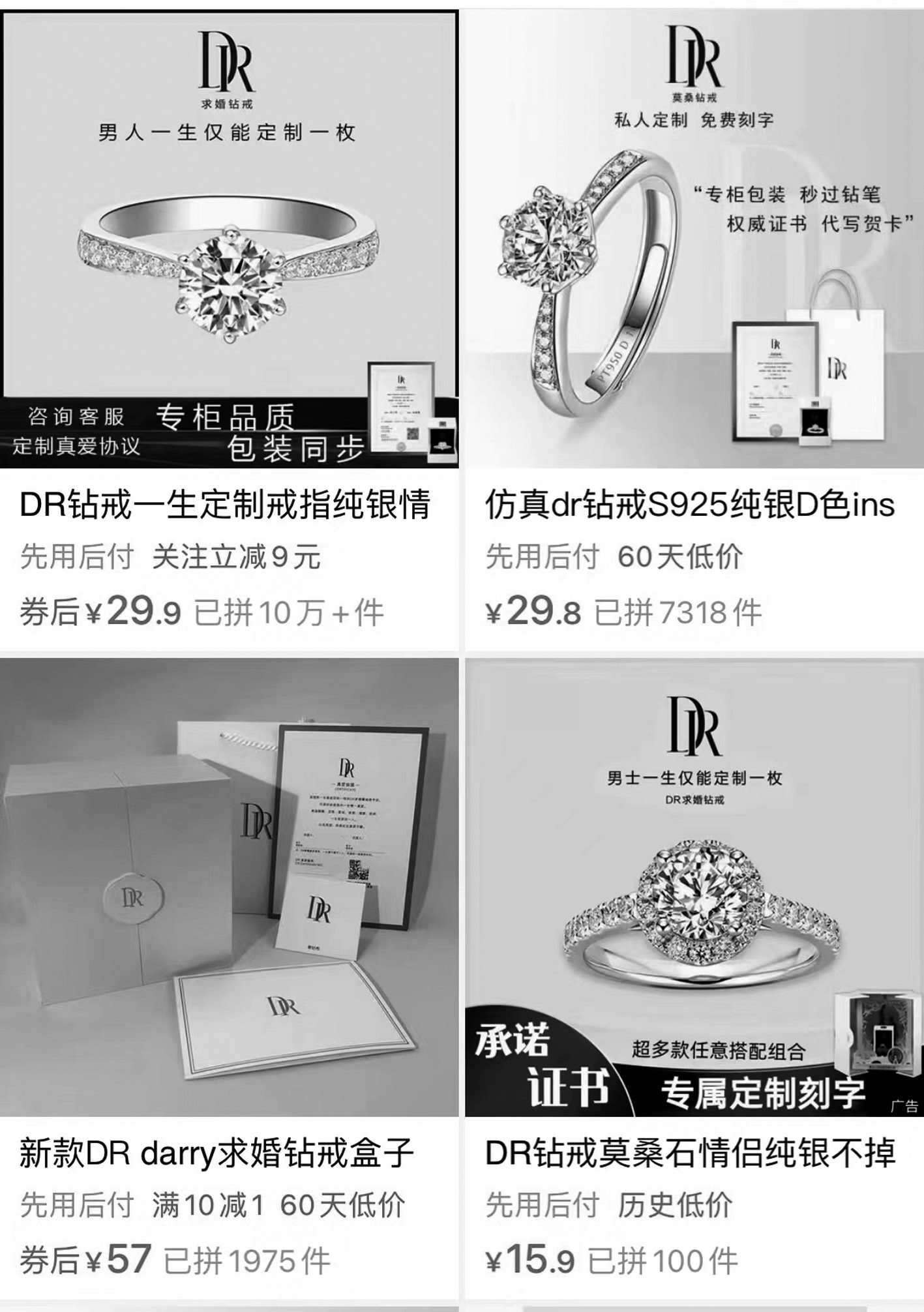 記者在一家電商平臺(tái)輸入“DR鉆戒”,映入眼簾的商品售價(jià)只要幾十塊,幾乎都把“男士一生僅能定制一枚”作為賣(mài)點(diǎn)。還有商家寫(xiě)道,“專(zhuān)柜品質(zhì)、包裝同步”“咨詢(xún)客服定制真愛(ài)協(xié)議”。