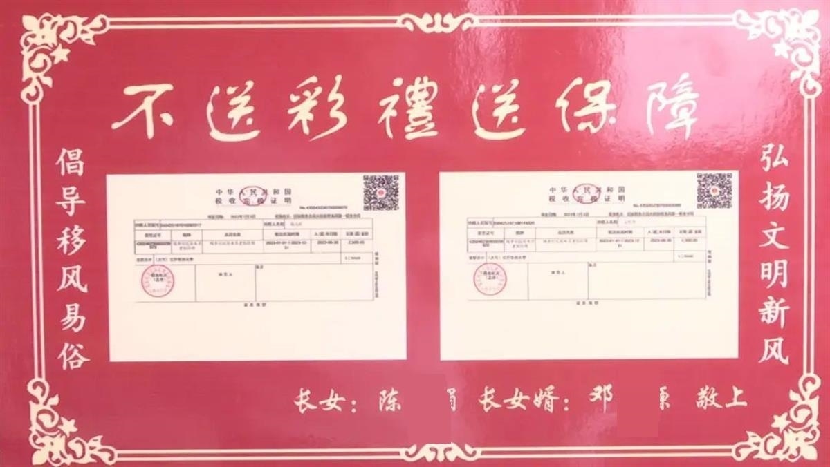 報(bào)道稱,8月17日,文江鎮(zhèn)的鎮(zhèn)村干部來(lái)到該鎮(zhèn)的聯(lián)盟村,將“不送彩禮送保障”的牌子送到新人陳某媚父母家中。文章配發(fā)的照片中,陳某媚的父母捧著印有兩張養(yǎng)老保險(xiǎn)繳費(fèi)單的牌子合影,底下的落款為長(zhǎng)女陳某媚和長(zhǎng)女婿鄧某塬的名字。