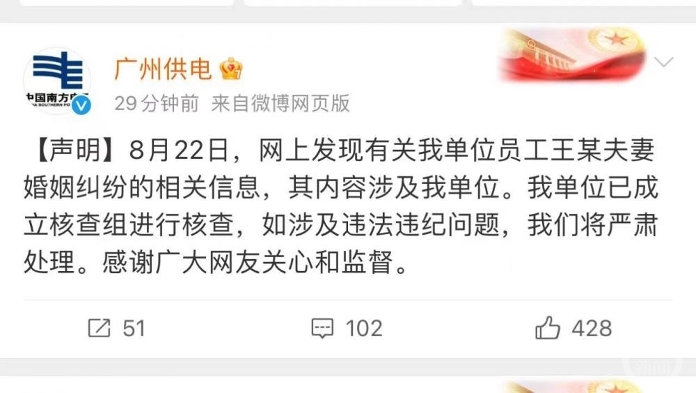 8月22日晚間,廣州供電局官方社交賬號發(fā)布聲明稱:“8月22日,網(wǎng)上發(fā)現(xiàn)有關(guān)我單位員工王某夫妻婚姻糾紛的相關(guān)信息,其內(nèi)容涉及我單位。我單位已成立核查組進(jìn)行核查,如涉及違法違紀(jì)問題,我們將嚴(yán)肅處理。感謝廣大網(wǎng)友關(guān)心和監(jiān)督?!?/p>