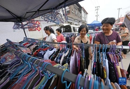 8月25日,在天津市靜海區(qū)臺頭鎮(zhèn),前來趕集的村民在大集上挑選商品。