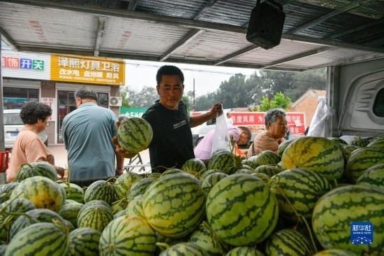 8月25日,在天津市靜海區(qū)臺頭鎮(zhèn),商戶為前來趕集的村民挑選臺頭西瓜。