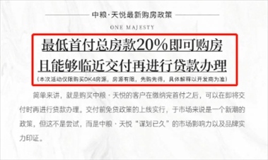 8月26日,紅星資本局向“中糧天悅”售樓部求證此時(shí),一名置業(yè)顧問(wèn)回復(fù)稱(chēng),最近確實(shí)推出了“先交付后還貸”的購(gòu)房政策,購(gòu)房者可以先交首付,簽訂購(gòu)房合同,交房前再辦理貸款即可。