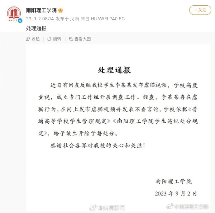 ·南陽理工學院再通報:對涉事虐貓學生給予開除學籍處分。
