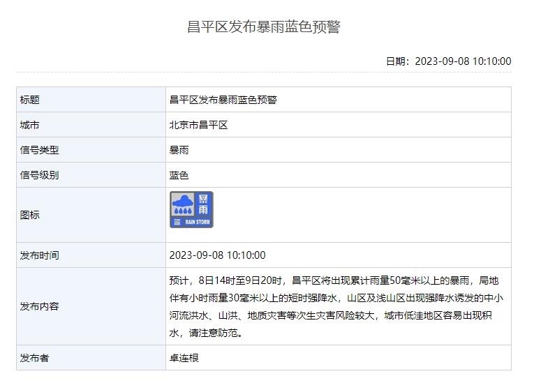 預(yù)計(jì),8日14時(shí)至9日20時(shí),昌平區(qū)將出現(xiàn)累計(jì)雨量50毫米以上的暴雨,局地伴有小時(shí)雨量30毫米以上的短時(shí)強(qiáng)降水,山區(qū)及淺山區(qū)出現(xiàn)強(qiáng)降水誘發(fā)的中小河流洪水、山洪、地質(zhì)災(zāi)害等次生災(zāi)害風(fēng)險(xiǎn)較大,城市低洼地區(qū)容易出現(xiàn)積水,請(qǐng)注意防范。