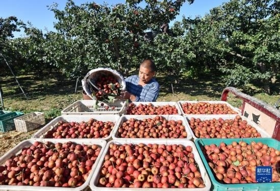 10月8日,河北省晉州市馬于鎮(zhèn)西賈莊村的農(nóng)民在果園分揀剛采摘的山楂。
