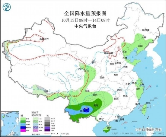 10月13日08時至14日08時,新疆西部、西藏南部等地部分地區(qū)有小雪或雨夾雪;四川南部、貴州中南部、云南大部等地部分地區(qū)有中到大雨,其中,云南東部局地有暴雨(50~80毫米)。新疆西北部、河北北部等地部分地區(qū)有5~6級風;臺灣海峽、巴士海峽、南海北部海域、北部灣等海域有5~7級風、陣風8級。(見圖2)。