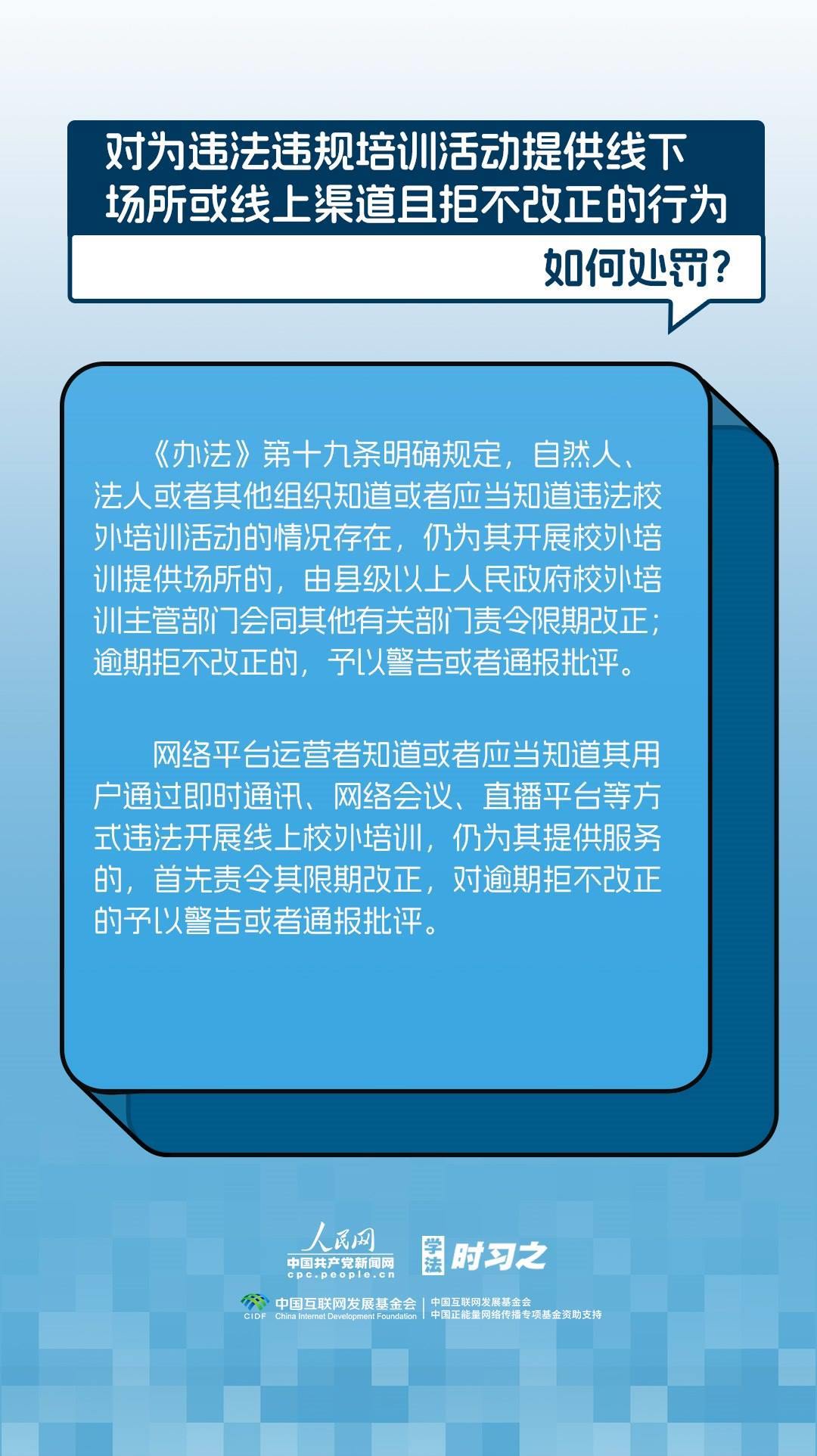 《校外培訓(xùn)行政處罰暫行辦法》(以下簡稱《辦法》)將于2023年10月15日起施行?!掇k法》提出了校外培訓(xùn)行政處罰總體要求。規(guī)定適用對象為面向社會招收3周歲以上學(xué)齡前兒童、中小學(xué)生,違法開展校外培訓(xùn)的自然人、法人或者其他組織。要求校外培訓(xùn)行政處罰應(yīng)當(dāng)遵循公正、公開的原則,堅(jiān)持處罰與教育相結(jié)合,引導(dǎo)自然人、法人或者其他組織自覺守法,共同抵制校外培訓(xùn)違法行為,營造有利于學(xué)生成長成才的良好環(huán)境。