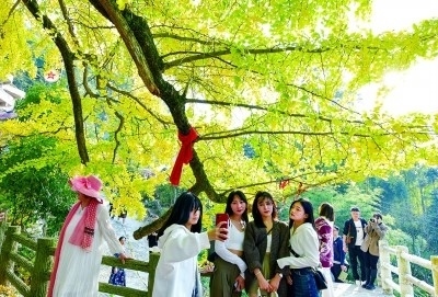 游客在貴州省貴陽(yáng)市烏當(dāng)區(qū)羊昌鎮(zhèn)黃連村的古銀杏樹(shù)下留影。新華社發(fā)