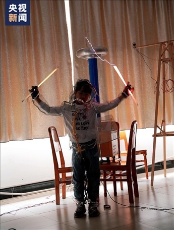 實(shí)驗(yàn)展示過程中,屈老師手持熒光燈管,逐漸靠近特斯拉線圈,轉(zhuǎn)瞬之間,一道電流好像穿過他的身體,形成絢麗的火花,現(xiàn)場畫面仿佛置身科幻電影。