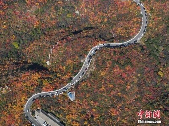 10月15日,航拍山西省太原市天龍山網紅橋秋景絢麗。近日,天龍山迎來秋景最佳觀賞期。中新社記者 武俊杰 攝