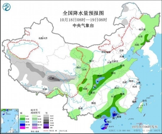 10月18日08時至19日08時,西藏北部和東部、青海南部和東部、川西高原北部等地的部分地區(qū)有小到中雪或雨夾雪,其中西藏東北部等地局地大雪;吉林東部、陜西南部、河南北部和西部、四川北部和東部、重慶、湖南東南部、江西中南部、廣東中西部、廣西東南部、海南島等地有中到大雨,其中,廣東西南部和中部、海南島等地的部分地區(qū)有暴雨,局地大暴雨(100~120毫米)。內(nèi)蒙古中東部、西北地區(qū)東部、河北北部、遼東半島、四川盆地中西部、廣西東南部等地的部分地區(qū)有4~6級風(fēng)。