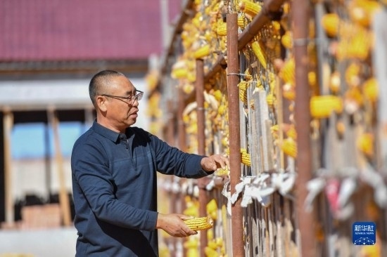 10月19日,在吉林省公主嶺市友忠種植農(nóng)民專業(yè)合作社,理事長(zhǎng)孫友忠查看科學(xué)儲(chǔ)糧倉(cāng)中的玉米儲(chǔ)存情況。