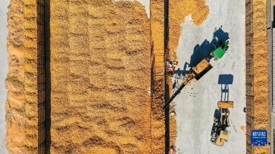 10月19日,在吉林省公主嶺市友忠種植農(nóng)民專業(yè)合作社,農(nóng)民將收獲的玉米放入科學(xué)儲(chǔ)糧倉(cāng)(無(wú)人機(jī)照片)。