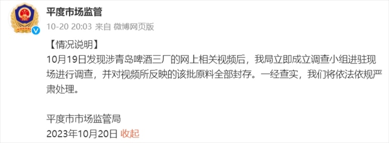《每日經(jīng)濟(jì)新聞》記者注意到,青島啤酒三廠所在地的平度市市場監(jiān)管局也發(fā)布情況說明稱,10月19日發(fā)現(xiàn)涉青島啤酒三廠的網(wǎng)上相關(guān)視頻后,我局立即成立調(diào)查小組進(jìn)駐現(xiàn)場進(jìn)行調(diào)查,并對視頻所反映的該批原料全部封存?!耙唤?jīng)查實(shí),我們將依法依規(guī)嚴(yán)肅處理?!?/p>