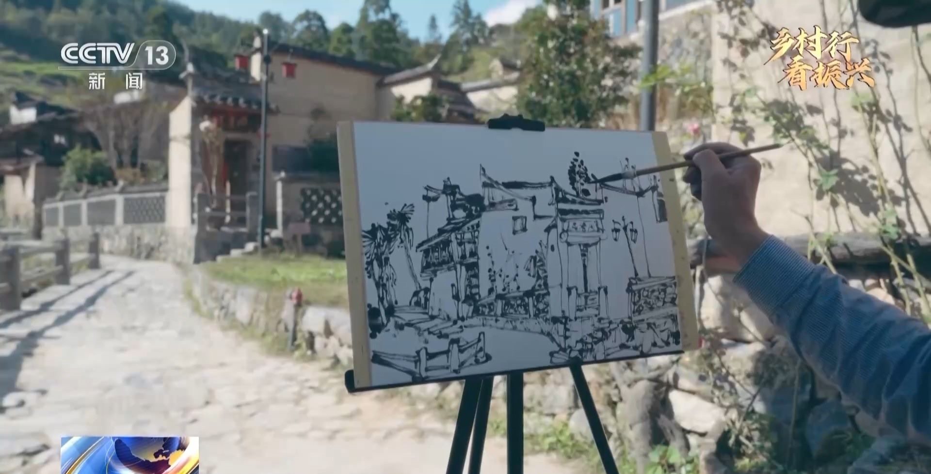 總臺記者 林姍蓉:這里就是龍?zhí)洞?。沿著溪水一路往下,你可以看到兩岸都是這種高低錯(cuò)落的土夯的民居。這個(gè)季節(jié)柿子都熟了,到處都可以看到村民曬柿餅、曬稻谷,黃綠交錯(cuò)的,非常好看。來到龍?zhí)?,還有一點(diǎn)非常讓我印象深刻,就是在這里每走幾步,我都可以看到一個(gè)正在寫生創(chuàng)作的藝術(shù)家。