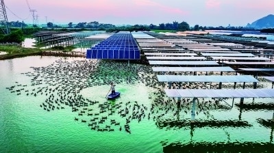 在廣西壯族自治區(qū)南寧市上林縣白圩鎮(zhèn)登山村,養(yǎng)殖戶在光伏板旁給鴨子喂食?!皾O光互補(bǔ)”拓寬了當(dāng)?shù)刂赂辉鍪盏那?。潘永攝